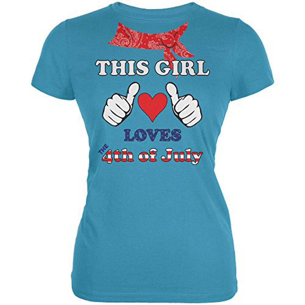 This 4th of July, boast your patriotic pride with this 100% soft cotton junior's t-shirt. This Old Glory design features the text, "This Girl Loves the 4th of July" in red, white and blue font with two thumbs pointing and a red bandana graphic around the collar.