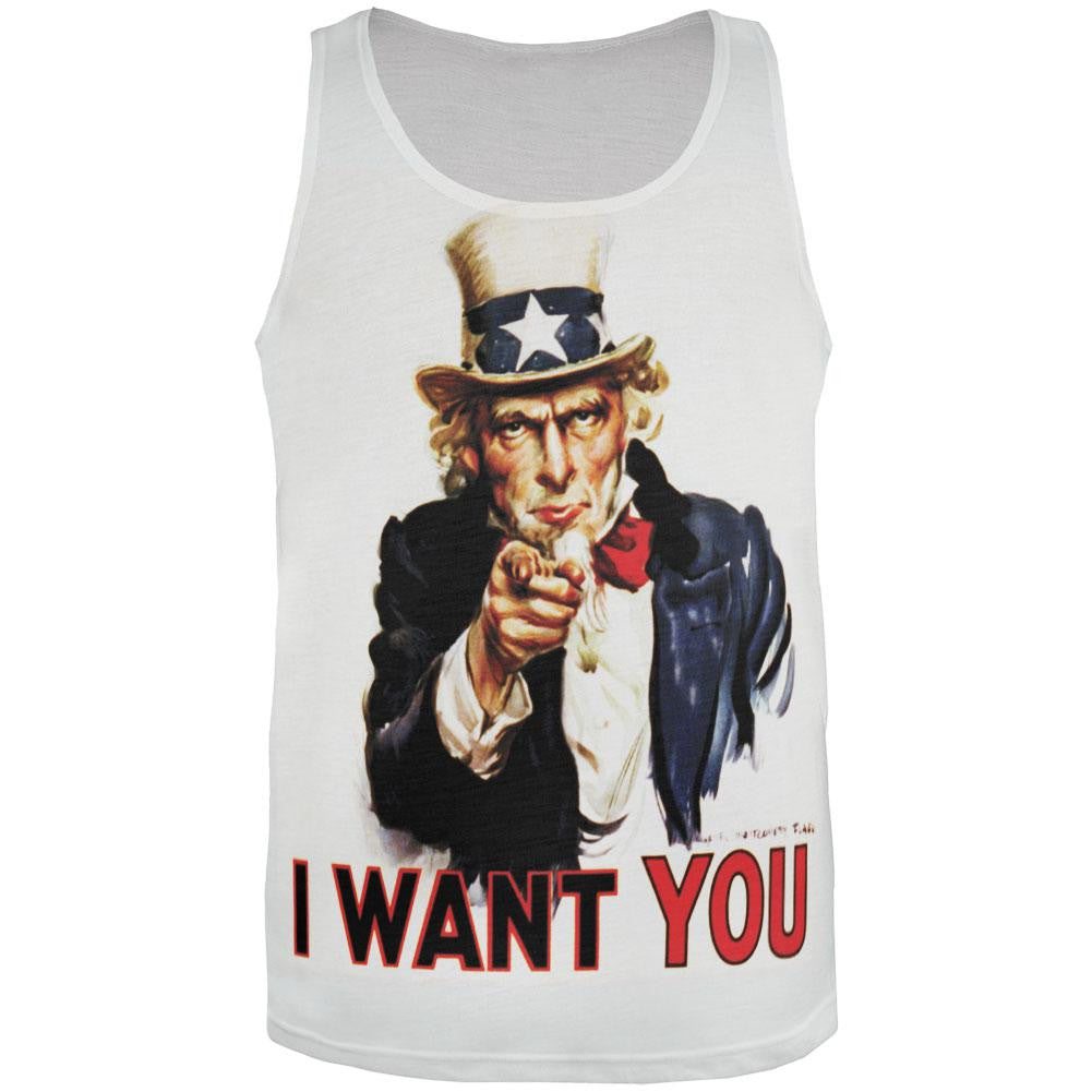 Show your patriotism with this classic representation of Uncle Sam. This Old Glory design is printed on a polyester adult tank top, featuring the Uncle Sam and the text, "Uncle Sam Wants You" on the front. The dye sublimation printing process causes slight differences that are unique to each individual garment.