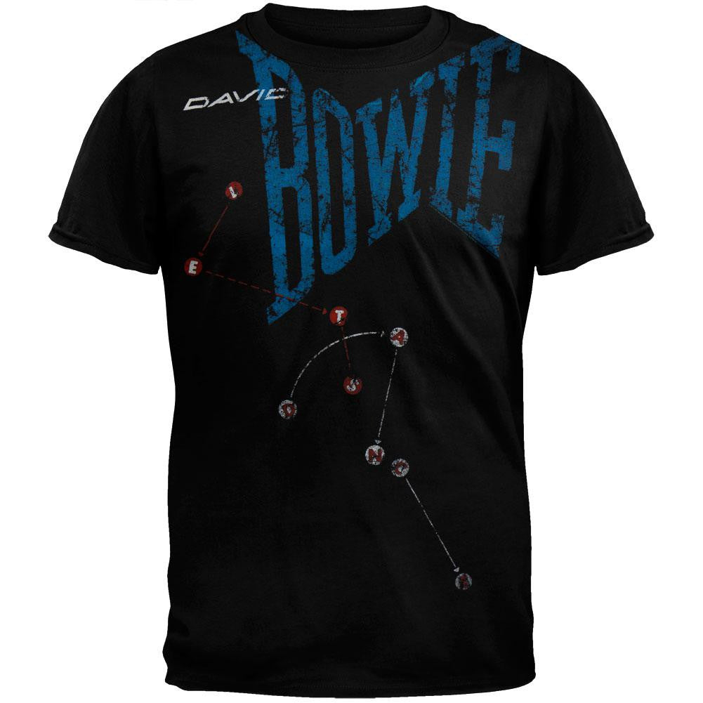 Know when to go out in this black, 100% cotton t-shirt from David Bowie, with an austere, distressed Subway print from the cover of his classic album Let's Dance across the front. Perfectly suited to a pair of red shoes and the song they're playin' on the radio."