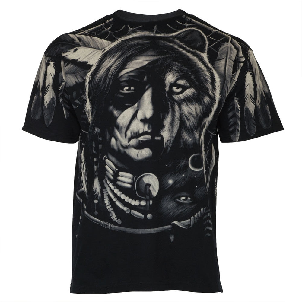 Amazing all over print of a Native American and his spirit guide - a metamorphasis central to Native American lore. Beautifully detailed t-shirt in heavyweight cotton.