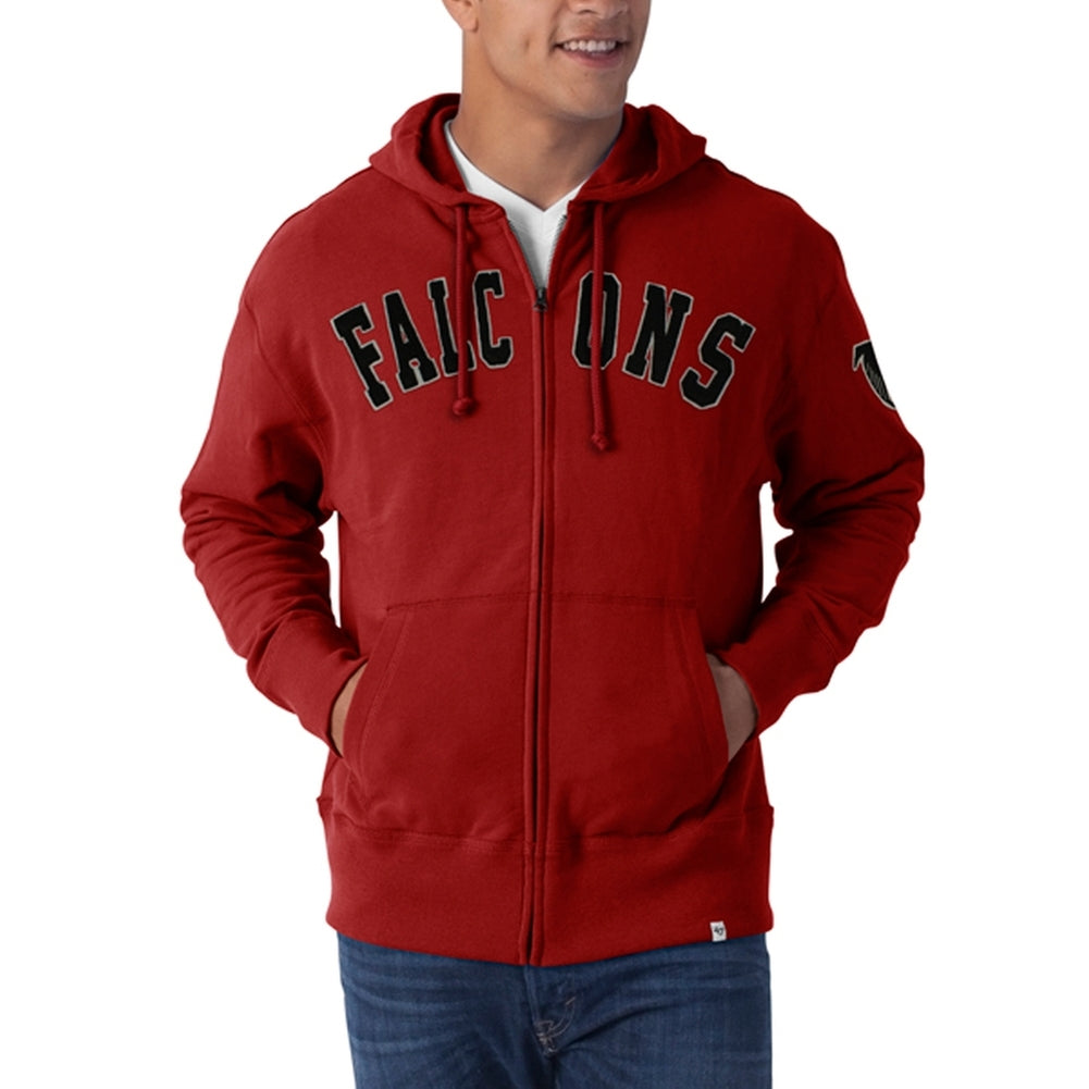 A classic style for Atlanta Falcons fans, this red cotton hoodie has exposed seams with a frayed edge against the top of the pockets and shoulders for a worn look. The football team's name is sewn in black applique' across the front, while the Falcons logo patch on the left sleeve gives the perfect finishing touch to this medium weight zip hoodie.