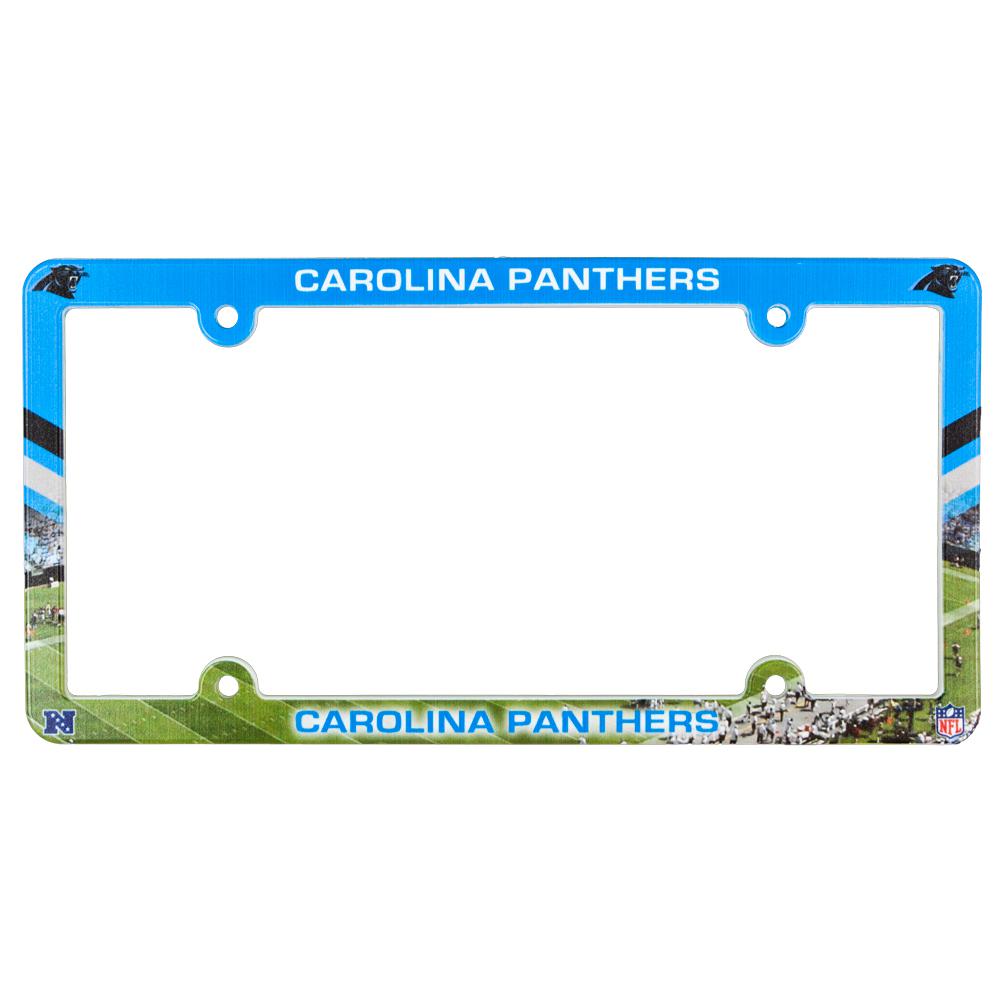 The Carolina Panthers bring this standard license plate frame featuring classic team logos at the top and bottom on top of a home field panoramic, with NFL, NFC, and team emblems in the corners. Give tailgaters something to gawk at.