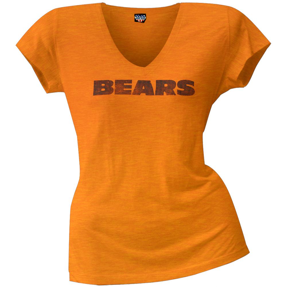 This Chicago Bears v-neck tee, in an orange 100% cotton space dye fabric with the football team's name in a distressed semi-transparent black print, is all a girl needs to look great while supporting the team.
