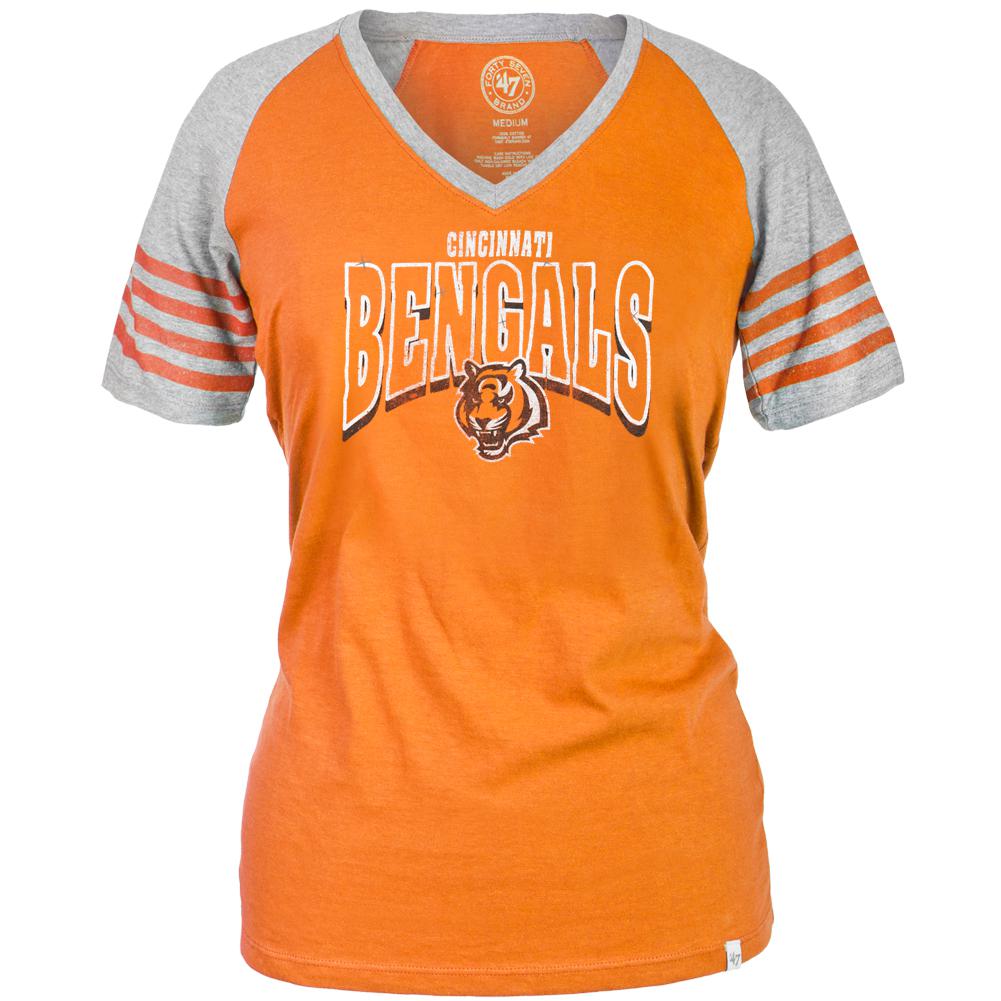 The Cincinnati Bengals name and logo have a subtle sparkle on this orange 100% cotton v-neck tee with semi-transparent, distressed print. The football team's shirt is in a baseball style jersey with gray heather raglan sleeves accented with four orange distressed bands; the perfect shirt to remember your favorite team during summer preseason.