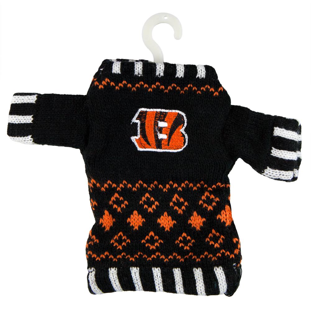 Celebrate the Holidays with this knit sweater ornament from the Cincinnati Bengals. Officially licensed by the NFL, this is a real, miniature knit polyester sweater with seasonal pattern and team logo embroidered on the front. Comes with a a hook hanger for the tree, mantle, and more