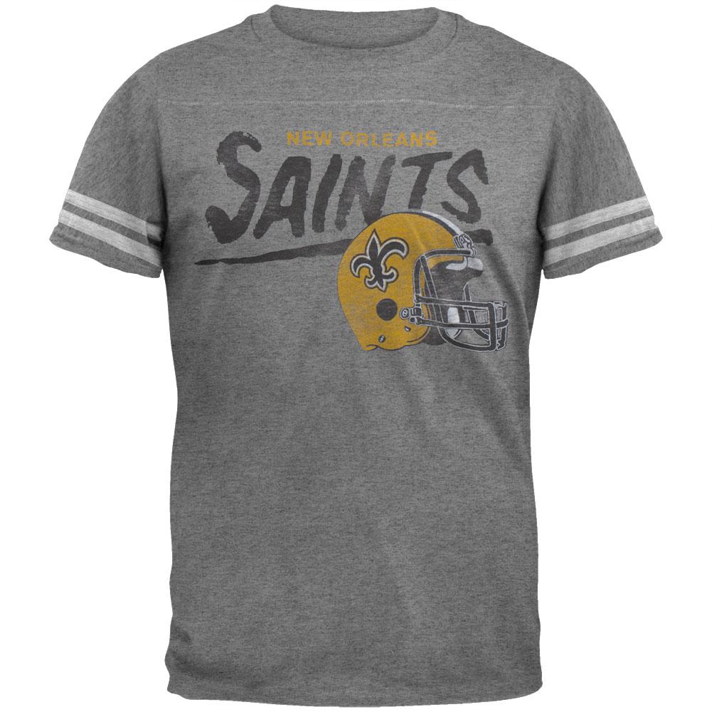 Support the New Orleans Saints with this awesome, grey, throwback soft t-shirt. With a blend of 50% polyester, 37% cotton, and 13% rayon, this shirt has a great vintage, worn feel to it. The slightly distressed logo and helmet give the feel of a life long fan's favorite t-shirt. The two white stripes on the sleeves also give this a great sport look.