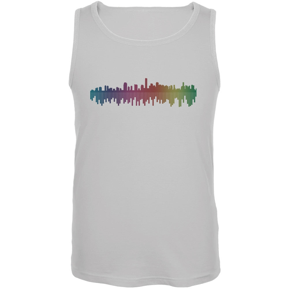 Audio levels merged with a city skyline. This original Old Glory design is printed using cutting-edge direct-to-garment technology on a high-quality 100% cotton classic fitted basic tank top.