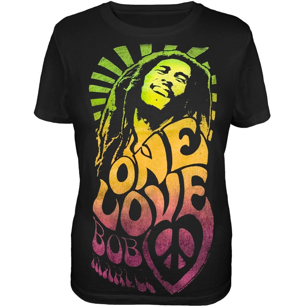 Officially licensed Bob Marley graphic tee from Zion Rootswear. 100% cotton, women's plus shirt features the reggae legend over a peace sign and the words: "One Love Bob Marley." Vibrant rainbow colors and super soft fabric make this a stand-out style for any Marley fan.