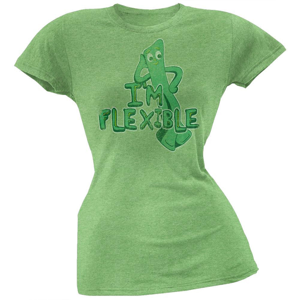 Gumby shows the goods on this green juniors t-shirt featuring the classic claymation creation in a sly, "I'm Flexible" slogan graphic. With a soft 52/48 cotton/polyester blend and highly distressed print for an authentic vintage look and feel, this is a clever, stylish tee for Gumby fans who don't want to bend over backwards to look good.
