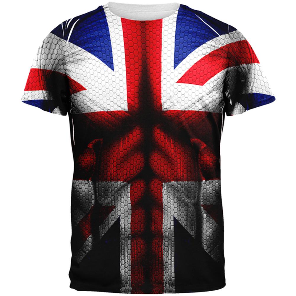 Be your favorite superhero, a Brit! This Old Glory design is printed on a polyester mens t-shirt, featuring an all over union jack design. The dye sublimation printing process creates slight imperfections that are unique to each item.